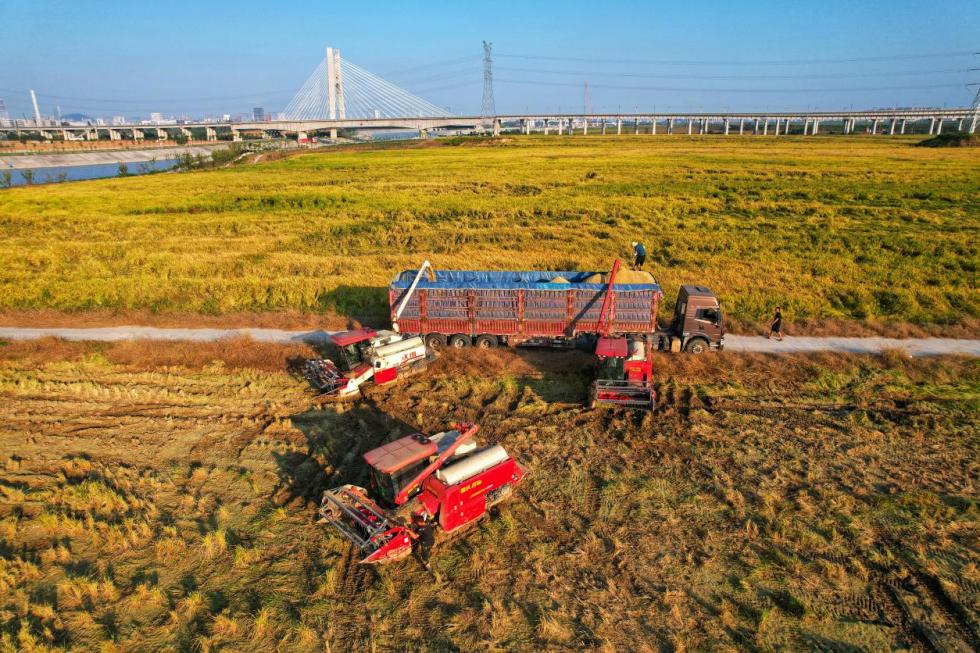 開鐮啦!引江濟(jì)淮棄土場變“米糧倉”金秋十月,正是豐收好時(shí)節(jié)。在合肥高新區(qū)引江濟(jì)淮蜀山樞紐南側(cè)的廣闊田野里,一臺(tái)臺(tái)收割機(jī)開足馬力,在金色的稻浪中歡快地穿梭,將沉甸甸的稻穗“吞”進(jìn)肚里,身后留下一行行整齊的稻茬。這幅火熱的秋收?qǐng)D景,為國慶假期增添了最動(dòng)人的色彩。這片孕育著希望的土地,幾年前還是引江濟(jì)淮工程的2#棄土場。如今,經(jīng)過科學(xué)的復(fù)墾改造----重新規(guī)劃田塊、修建生產(chǎn)道路和灌溉設(shè)施、運(yùn)用中國科學(xué)院南京土壤研究所“快速構(gòu)建耕作層”的專利技術(shù)、結(jié)合復(fù)墾地土壤特點(diǎn)科學(xué)選種、科學(xué)管護(hù)……,這片5000余畝的土地在精心照料下,已然重獲新生,變成了肥沃的良田?!?0月6日開的鐮,趁著天氣好,得抓緊干